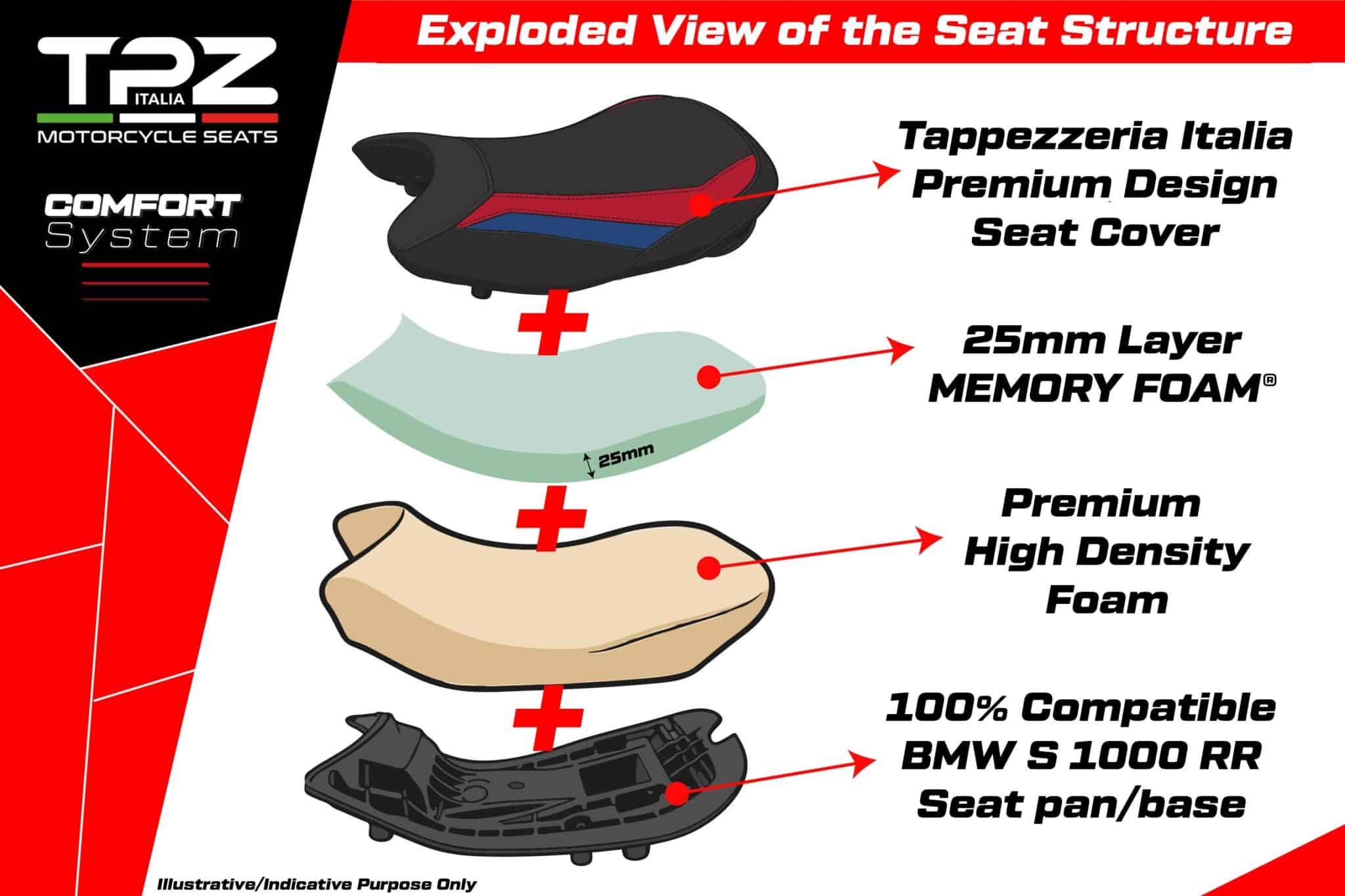 OBSAHUJE: ZÁKLADŇU A PENU AKO ORIGINÁL, 100% KOMPATIBILNÉ S UPEVŇOVACÍMI SYSTÉMAMI A ROZMERMI MOTOCYKLA, PLUS ĎALŠIU 2,5 CM VRSTVU PAMÄŤOVEJ PENY (KOMFORTNÝ SYSTÉM) A EXKLUZÍVNY POVLAK TAPPEZZERIA ITALIA.