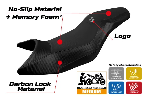 Platí pre poťahy Comfort systém - Vďaka pamäťovej pene o hrúbke 2,3 cm, sedadlo bude trochu vyššie. V skutočnosti po sadnutí na motocykel je poloha jazdca vyššia len o 5 - 7 mm.