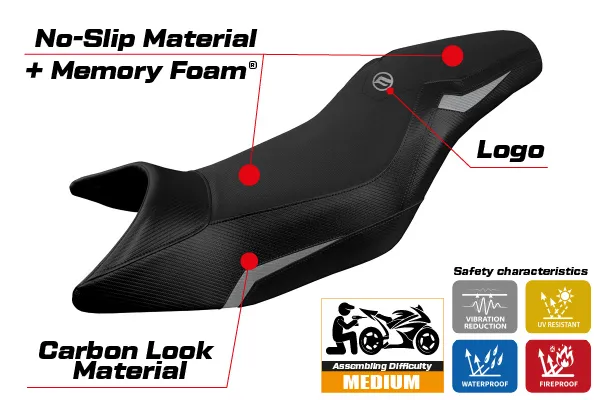 Platí pre poťahy Comfort systém - Vďaka pamäťovej pene o hrúbke 2,3 cm, sedadlo bude trochu vyššie. V skutočnosti po sadnutí na motocykel je poloha jazdca vyššia len o 5 - 7 mm.