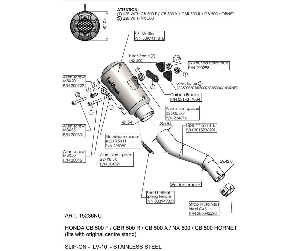 Koncovka LV-10 bola vyvinutá v spolupráci s najlepšími tímami MOTO2 a MOTO3, priamo zo skúseností z MotoGP a SBK . Bol navrhnutý výfukový systém s extrémne kompaktnými rozmermi na dosiahnutie minimálnej váhy s najlepším výkonom a nezameniteľným závodným zvukom. Vyrobené výlučne z nehrdzavejúcej ocele AISI 304, karbónu, alebo titánu, matná konečná úprava a laserové logo Leovince. Zadné nehrdzavejúce oceľové pletivo koncového uzáveru dáva tlmiču závodný vzhľad.