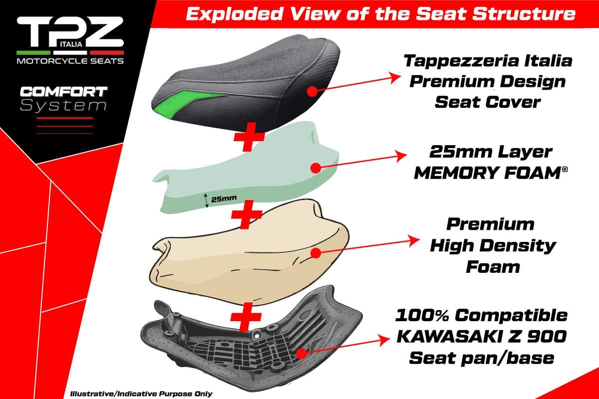 OBSAHUJE: ZÁKLADŇU A PENU AKO ORIGINÁL, 100% KOMPATIBILNÉ S UPEVŇOVACÍMI SYSTÉMAMI A ROZMERMI MOTOCA, PLUS ĎALŠIU 2,5 CM VRSTVU PAMÄŤOVEJ PENY (KOMFORTNÝ SYSTÉM) A EXKLUZÍVNY POVLAK TAPPEZZERIA ITALIA.