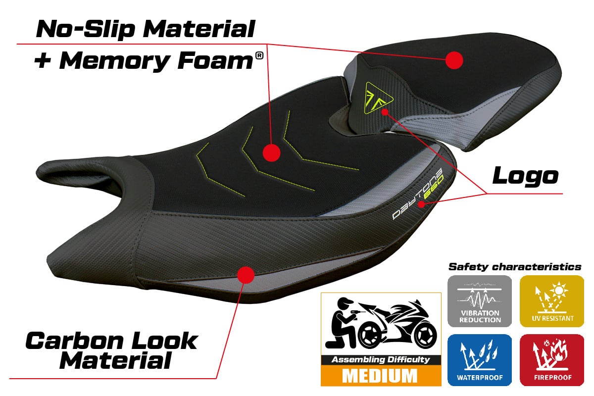 Poťahy sedadiel Tappezzeria Italia sú vyrobené z vysoko kvalitných 100 % PVC technických materiálov námornej kvality, potlačených rôznymi textúrami, ako je karbónový vzhľad, ultragrip, cordura, semiš, koža a ďalšie. Sú špeciálne navrhnuté pre lepšiu priľnavosť a štýl.