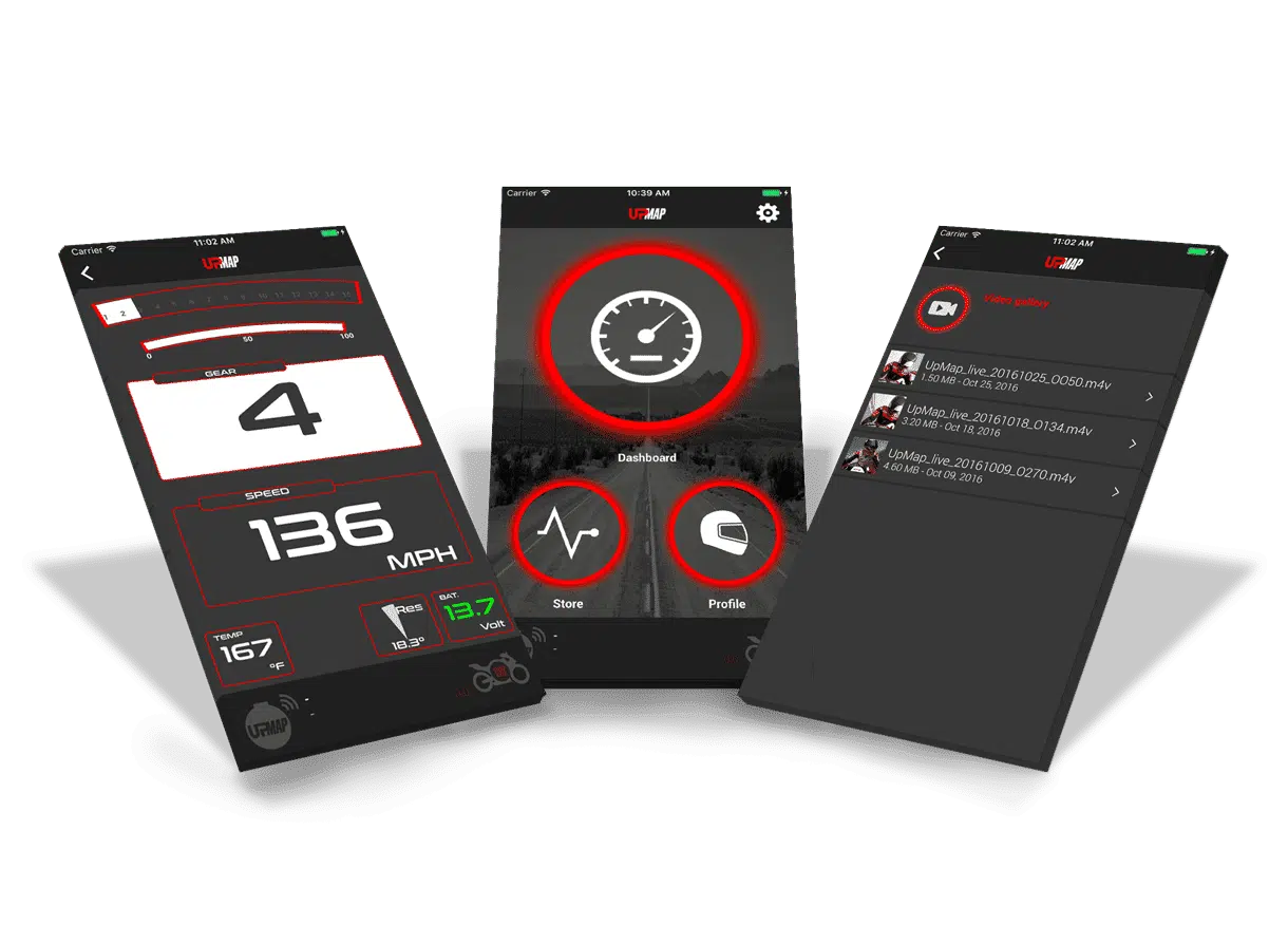 UpMap nie je len mapovanie, je to systém určený pre motocyklistov. Palubná doska , palubný počítač, zobrazuje zdravotný stav vozidla, prípadné závady zistené počas jazdy a monitoruje spotrebu. Funkcia Camera vám dáva možnosť vytvárať efektné videá obohatené o infografiku údajov zaznamenaných počas vášho vystúpenia.