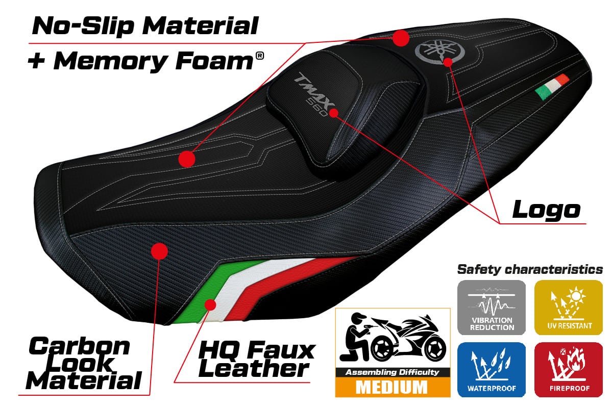 Poťahy sedadiel Tappezzeria Italia sú vyrobené z vysoko kvalitných 100 % PVC technických materiálov námornej kvality, potlačených rôznymi textúrami, ako je karbónový vzhľad, ultragrip, cordura, semiš, koža a ďalšie. Sú špeciálne navrhnuté pre lepšiu priľnavosť a štýl.