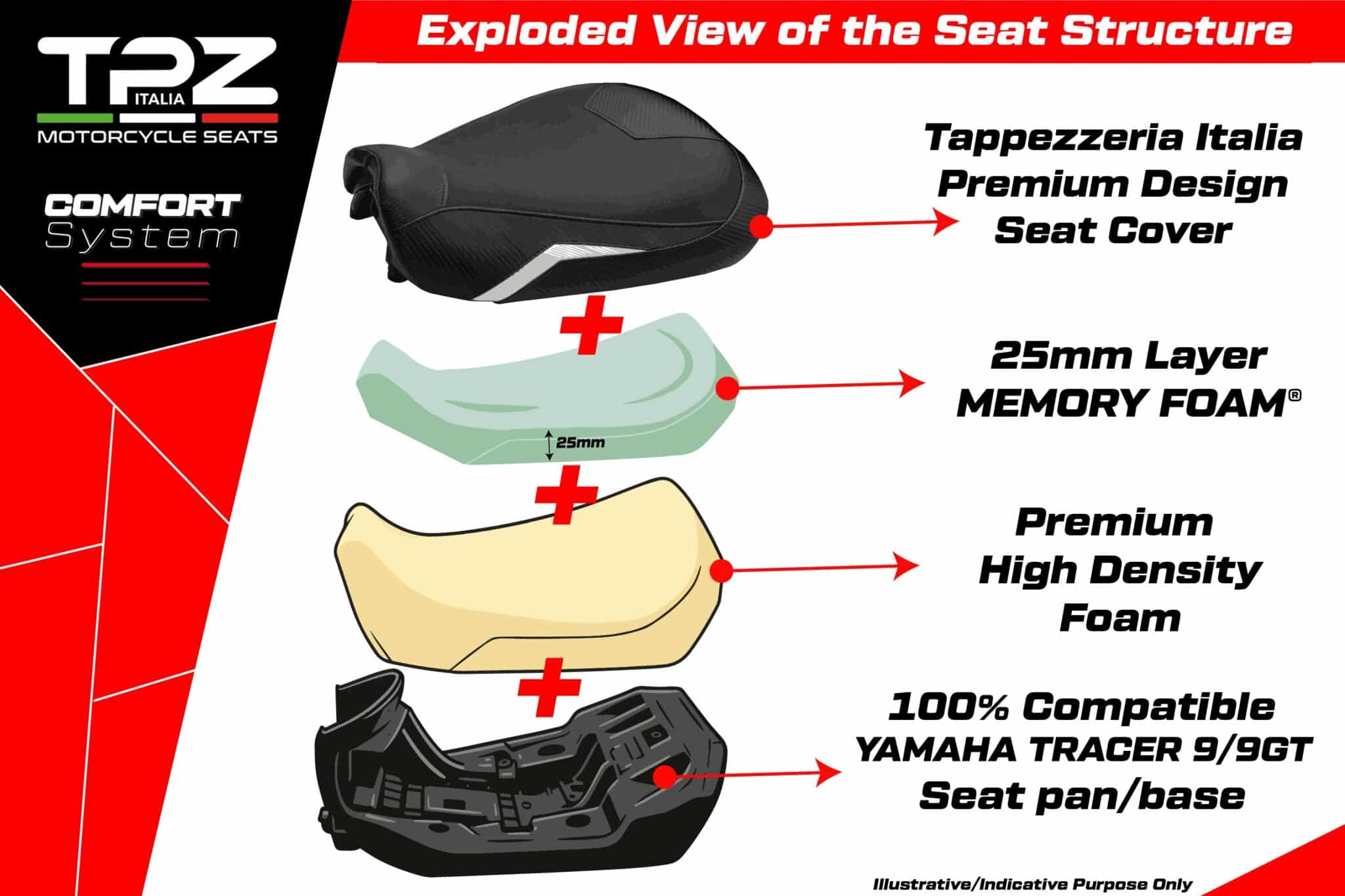 OBSAHUJE: ZÁKLADŇU A PENU AKO ORIGINÁL, 100 % KOMPATIBILNÉ S UPEVŇOVANÍM A ROZMERMI MOTOCYKLA, PLUS ĎALŠIU 2,5 CM VRSTVU PAMÄŤOVEJ PENY (KOMFORTNÝ SYSTÉM) A EXKLUZÍVNY POVLAK TAPPEZZERIA ITALIA.
